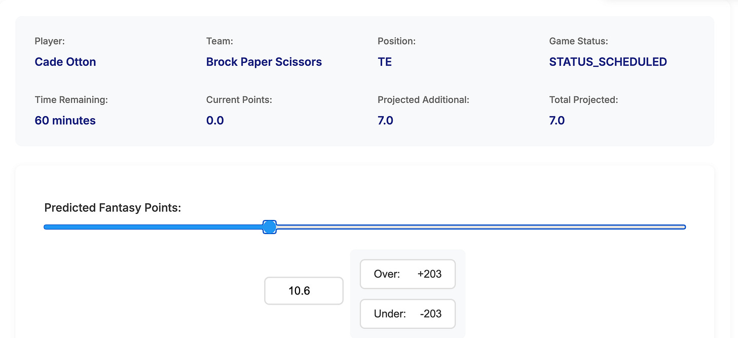 Here at Fantom Odds, we create customized odds for your fantasy football leagues (ESPN, Yahoo and Sleeper) for you and your leaguemates to use. One of our markets is alternate over/under player fantasy points, where you can adjust a player’s final fantasy point tally to whatever number of your choosing and the odds will adjust.